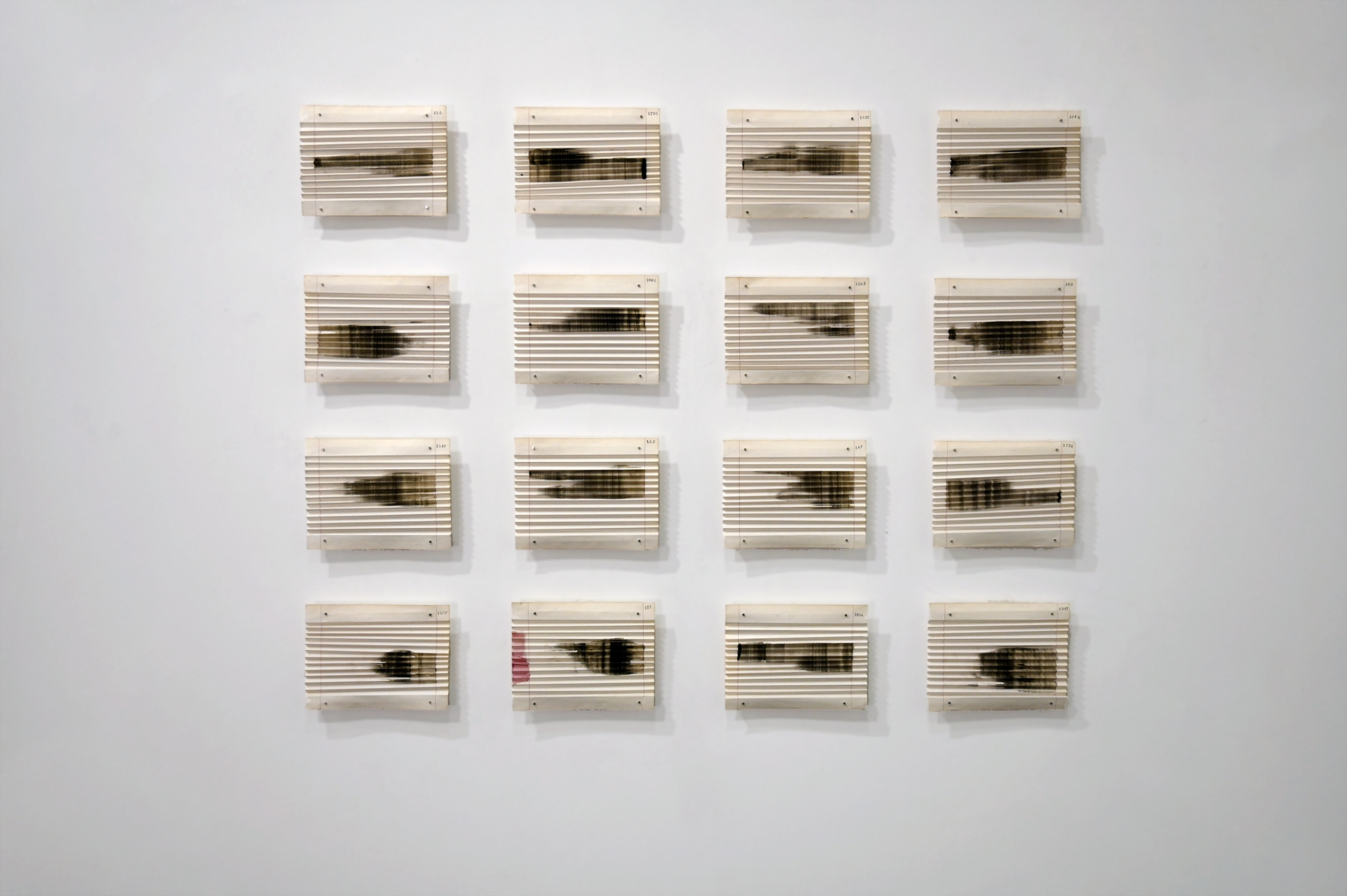 Twenty four folded drawings in ink on found paper. The hand-stamped numbers were already on the paper. Each drawing is approx 6” by 9”